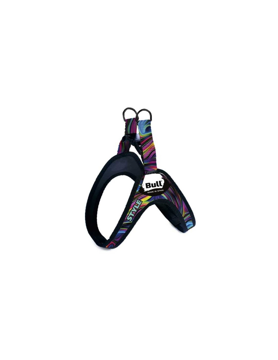 Moderno y resistente arnés deportivo para perros, con diseño multicolor.