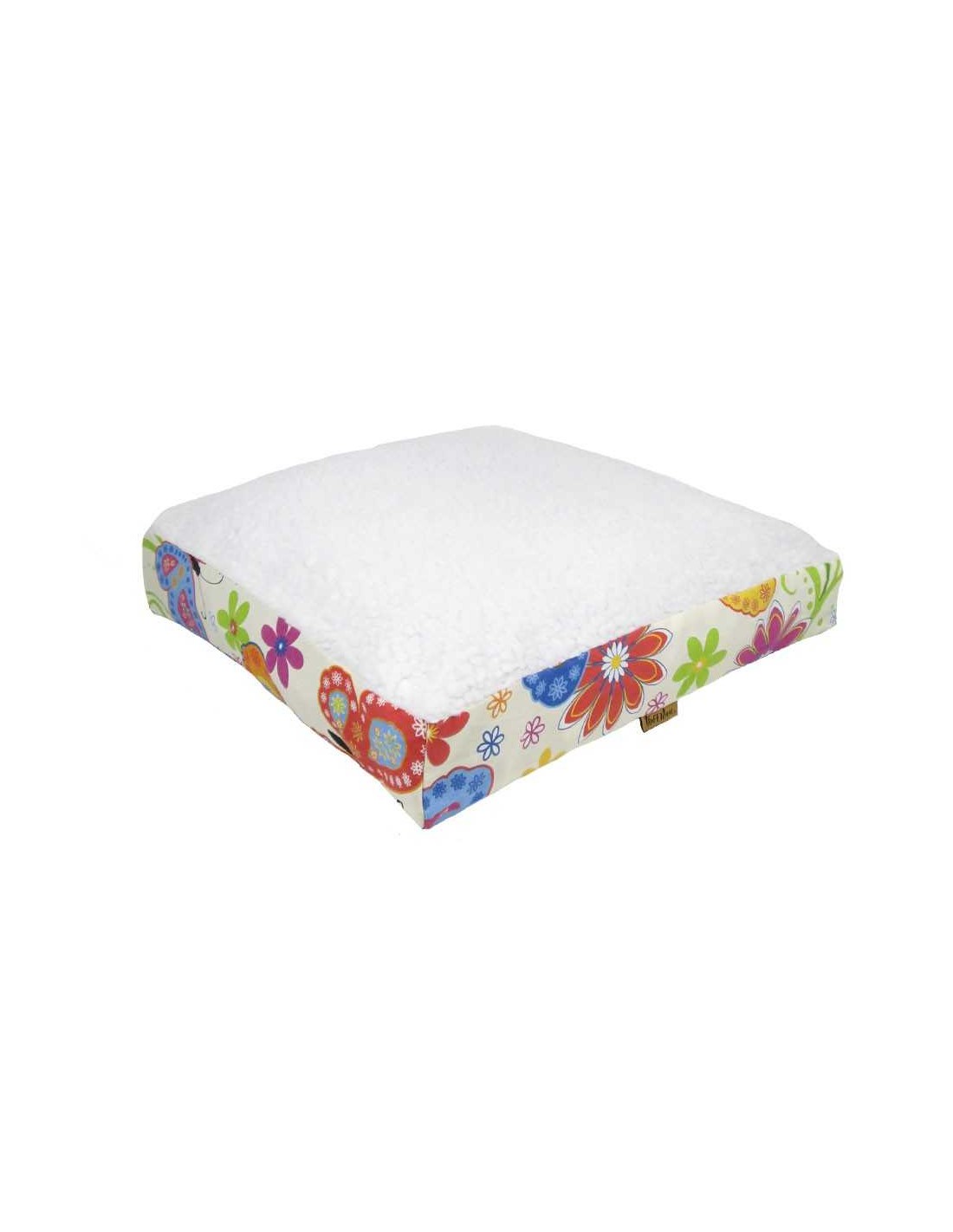 Precioso cojín cuadrado con borreguito blanco en la parte superior y con estampado de mariposas.