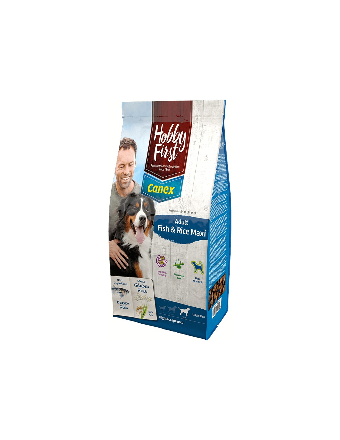 El pienso HobbyFirst Canex Adult Fish & Rice Maxi es un alimento para perros extrusionado para perros adultos de raza grande.
