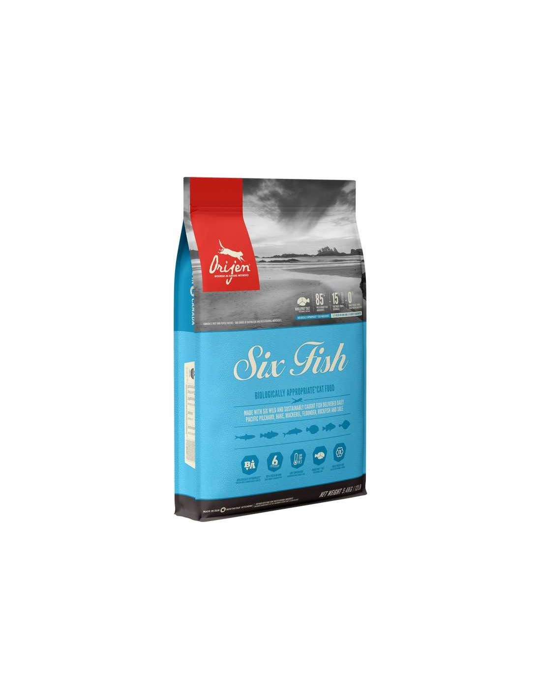 - Con un 40% de proteína abundantemente nutritiva y carbohidratos de bajo índice glucémico limitados al 16%, ORIJEN SIX FISH alimenta a gatos de todas las razas y en todas sus etapas de vida de acuerdo con sus necesidades evolutivas y biológicas.