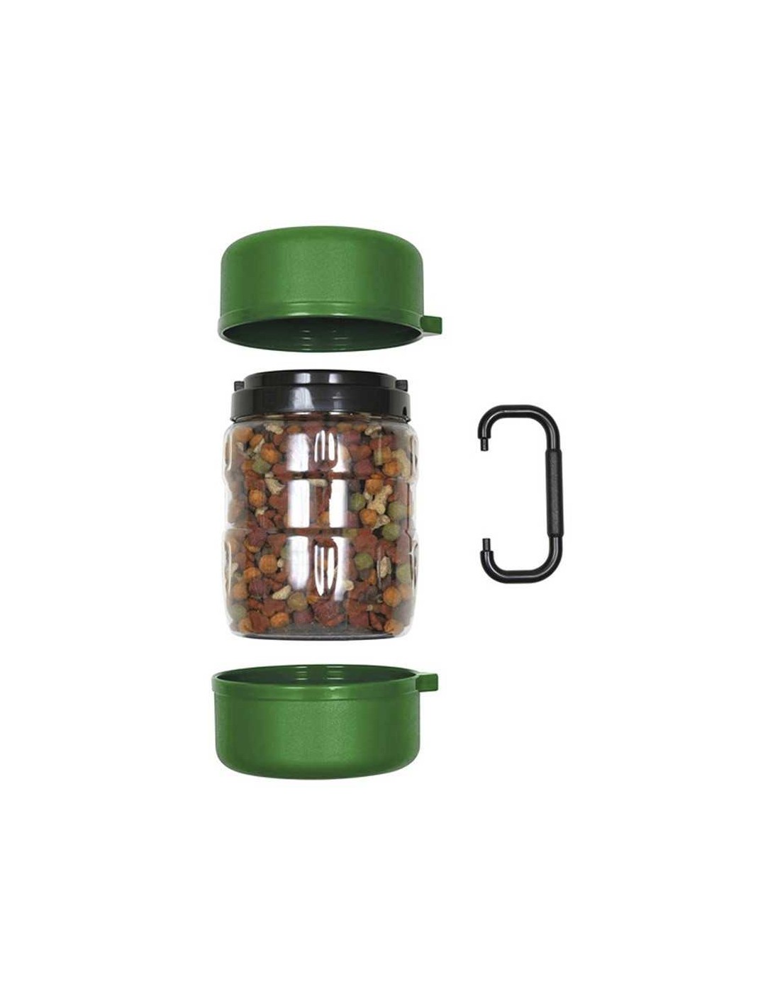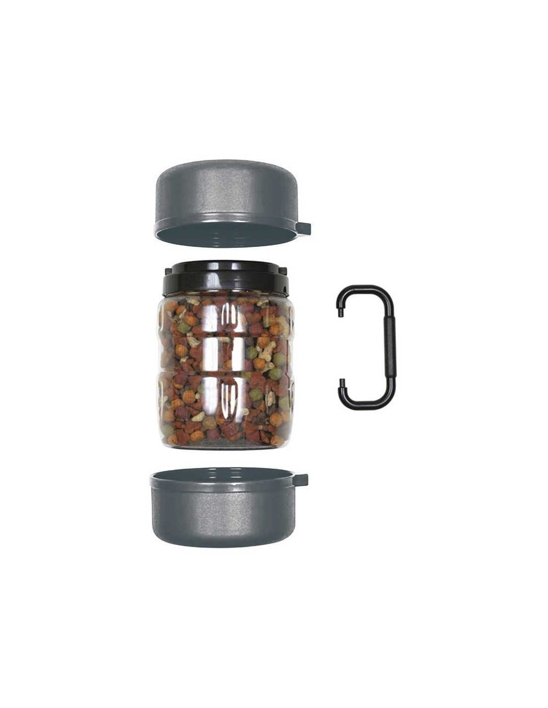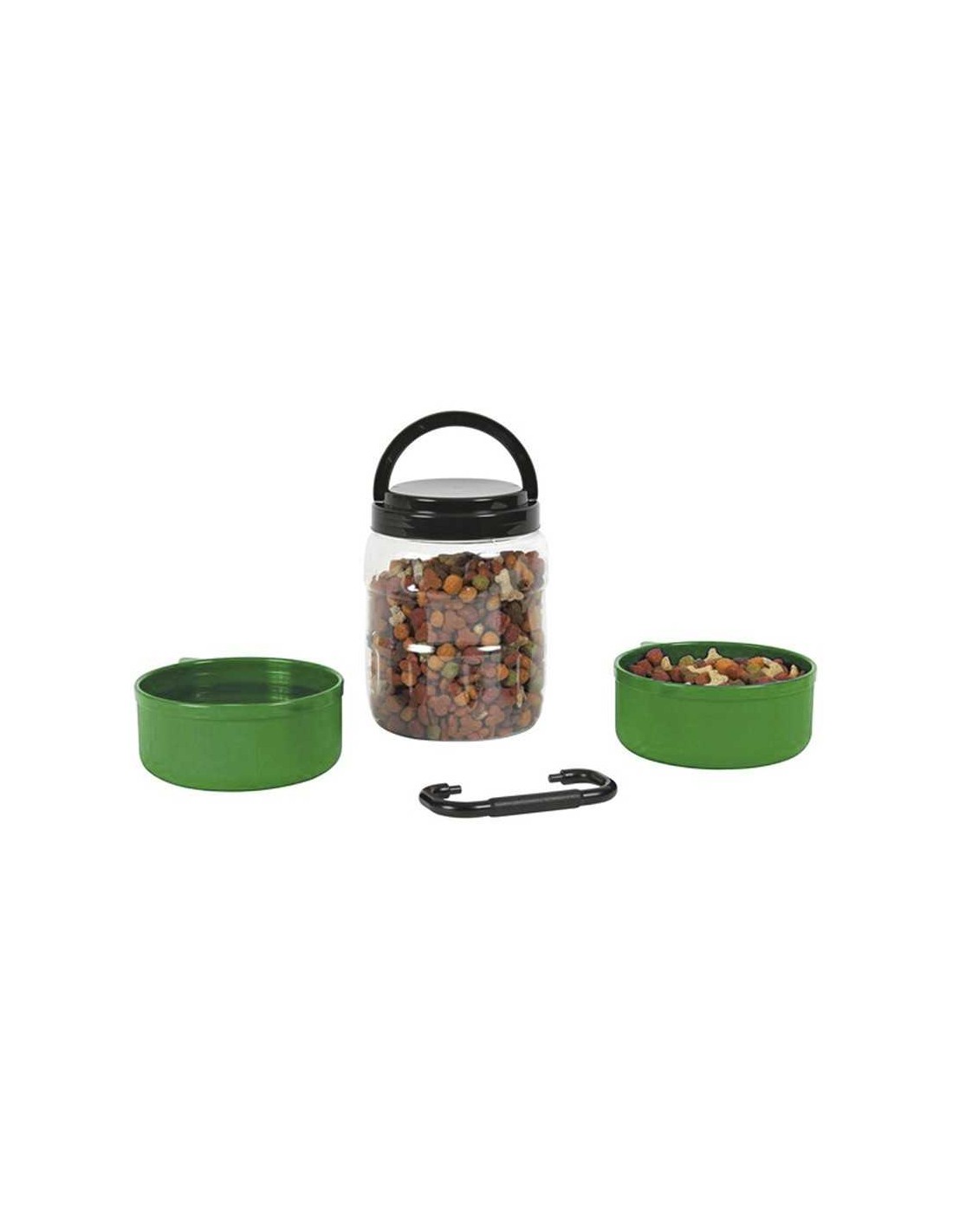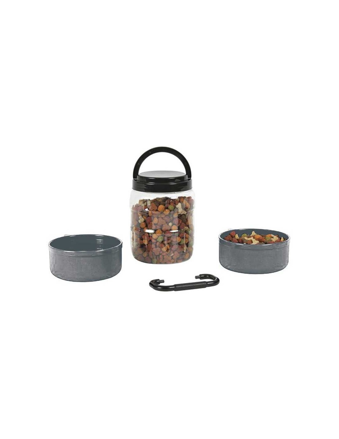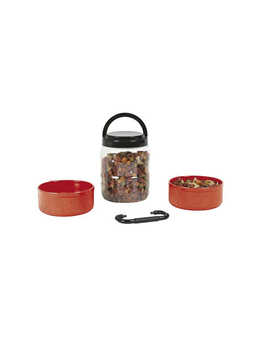 Set de deposito (1,5 litros) y dos platos integrados (500 ml cada uno) con un asa de unión para optimizar su volumen y facilitar su manejo y transporte.
