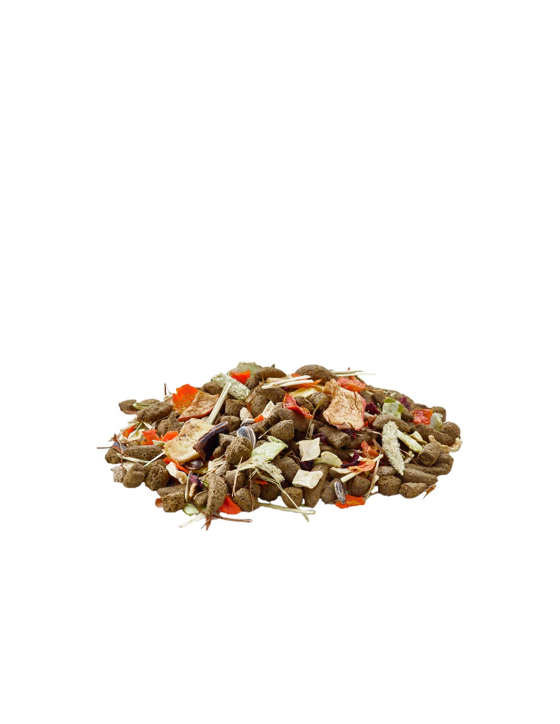 Su mezcla rica en fibras incluye feno de Timothy, coques de soja, harina de patata, semillas de girasol, caroube concassée, guisantes partidos, avena, linaza, y una variedad de verduras y hierbas frescas.