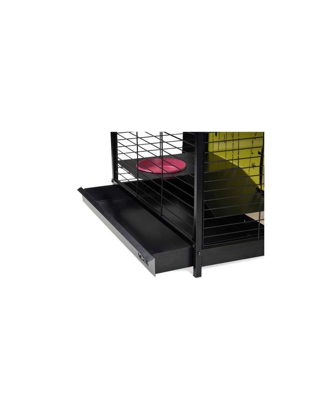 Fabricada en metal resistente y con un diseño moderno en color negro, esta jaula cuenta con una bandeja extraíble para facilitar la limpieza y dos puertas frontales para un fácil acceso.