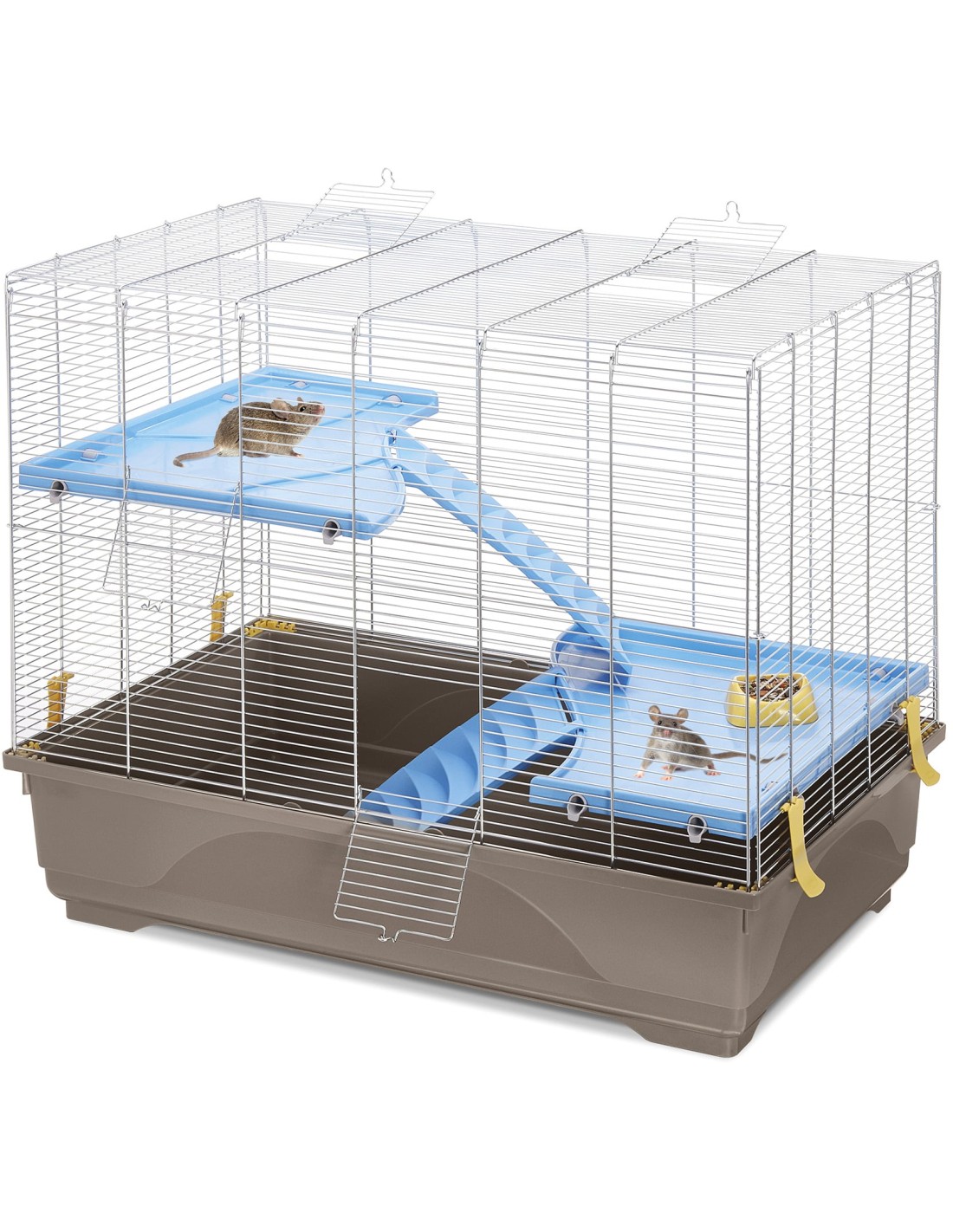 La jaula incluye una rueda de ejercicio, un comedero, un bebedero y una casita, cubriendo todas las necesidades básicas de tus roedores.